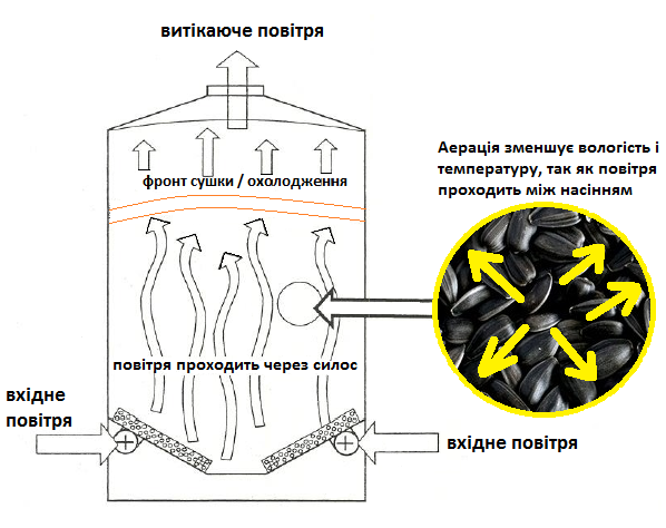 Обычно для хранения и аэрации семян подсолнечника, используют силоса, оборудованные специальными вентиляторами, которые нагнетают воздух в силос, воздух, проходя через массу семян подсолнечника, находится в силосе, способствует испарению влаги из семян и охлаждает его.